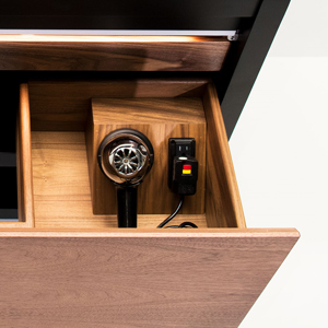 Your hair dryer deserves a good home. Keep the wires off your countertop and off the floor by hiding your hair dryer inside your vanity. Our Hair Dryer/Power for Drawer option is a great addition to any bathroom.