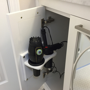 Keep your wires hidden by adding our Hair Dryer / Curling Iron holder to any door cabinet.