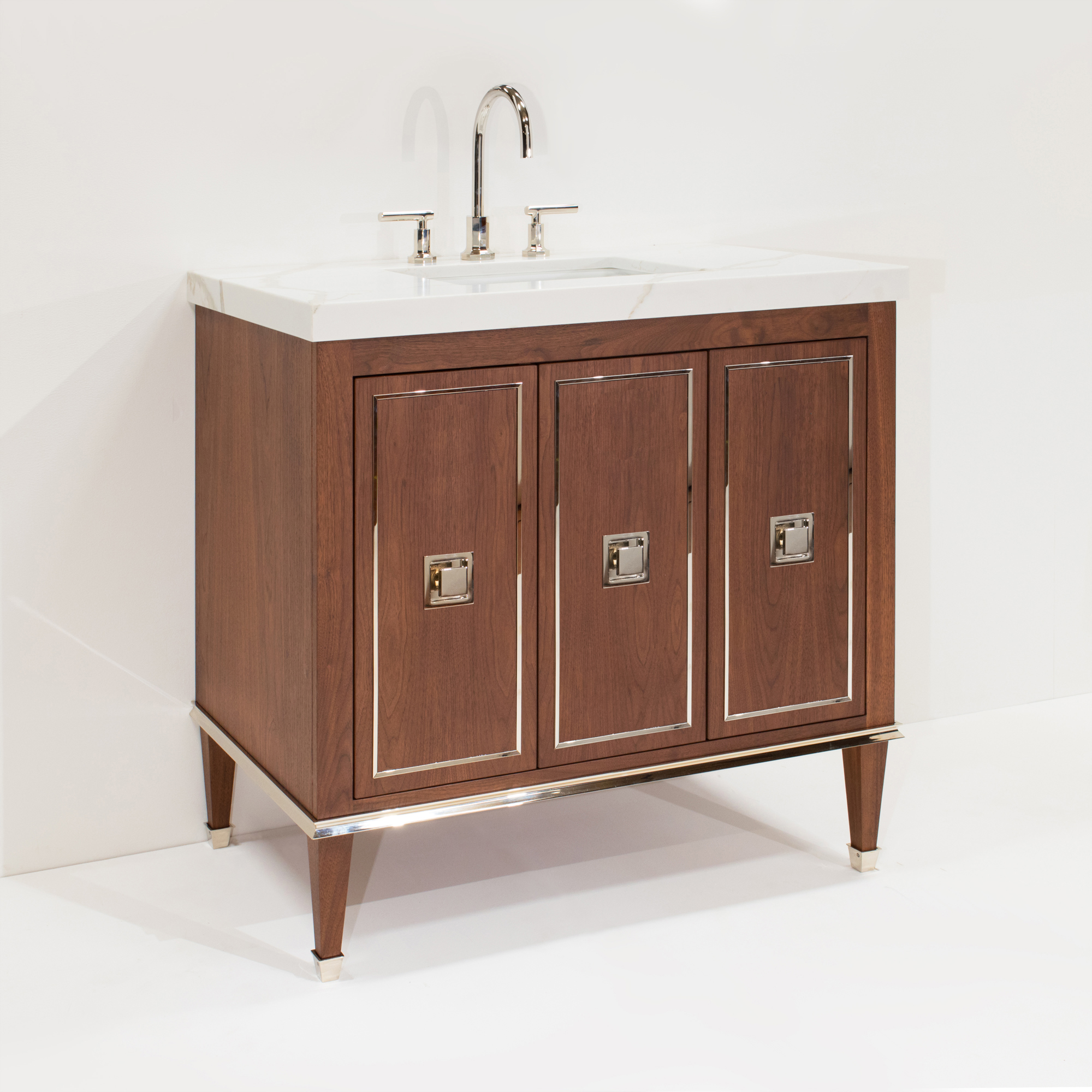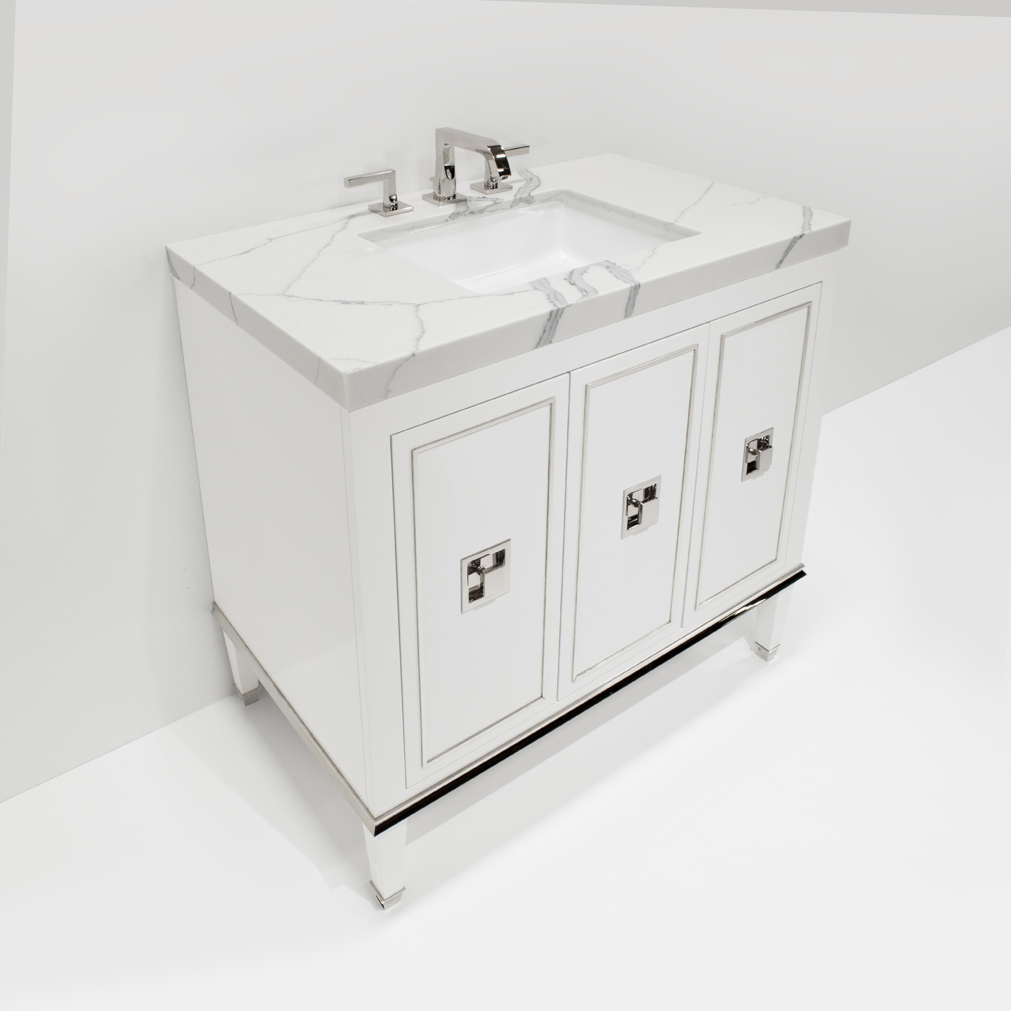 If you’re into glitz and glamour, Henley won’t disappoint. Henley includes a 1/4" metal inlay on each panel plus a 3/4" metal trim detail that wraps the base. For storage, Henley utilizes our popular configuration set with double drawer pullouts behind non sink doors. Like all designs, decorative pulls and cap feet must be ordered separately.