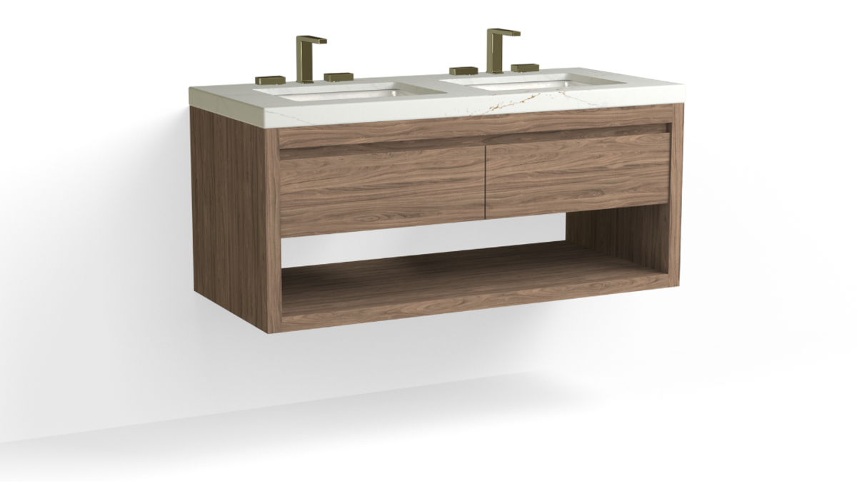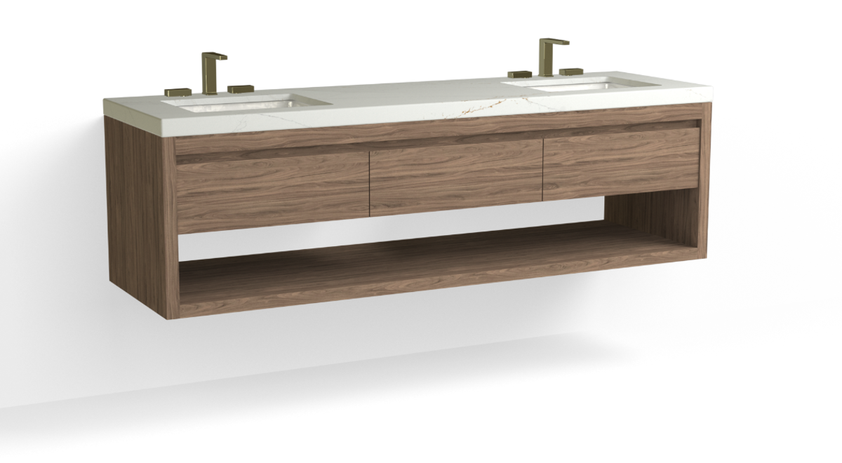 Turino is a hybrid of several other designs. This design features thicker end panels, an open shelf, and integrated finger pulls.