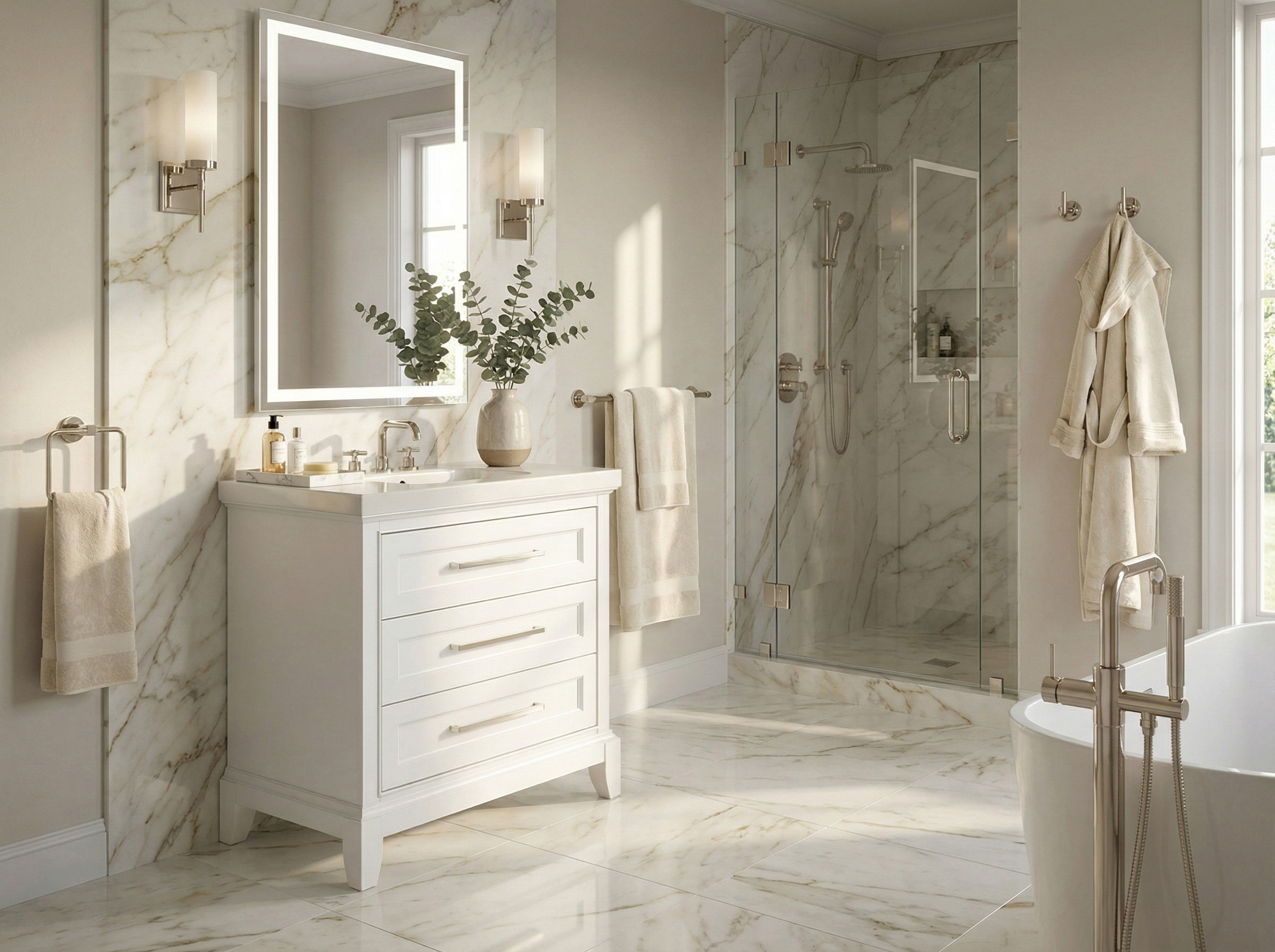 Quartz countertops are a low-maintenance option, perfect for any busy bathroom. Made from the strongest natural mineral found on earth and mixed with resin, they're nonporous, stain-resistant and easy to clean. You'll never have to seal, condition or polish a quartz countertop.